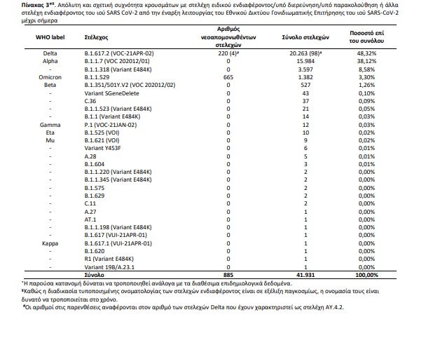 Εκ των 885 δειγμάτων με στελέχη ειδικού ενδιαφέροντος, τα 665 αφορούν στο Omicron και 220 αφορούν στο στέλεχος Delta (Πίνακας 3).