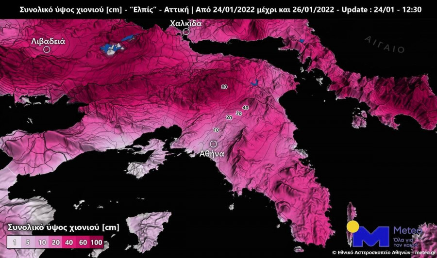 Σύμφωνα με τα αποτελέσματα του αριθμητικού μοντέλου πρόγνωσης καιρού του Εθνικού Αστεροσκοπείου Αθηνών / Meteo.gr, το εκτιμώμενο αθροιστικό ύψος χιονιού για την περιοχή της Αττικής για το χρονικό διάστημα μεταξύ Δευτέρας 24/01 και Τρίτης 25/01/2022, παρουσιάζεται στον παρακάτω Χάρτη. Τα μεγαλύτερα ύψη χιονόστρωσης εκτιμώνται κυρίως για τα βόρεια τμήματα της Αττικής.