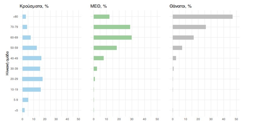 Ακολούθως παρουσιάζεται η ηλικιακή κατανομή των (α) συνολικών κρουσμάτων, (β) των περιστατικών που κατέληξαν σε θάνατο και (γ) των ασθενών που νοσηλεύονται διασωληνωμένοι: