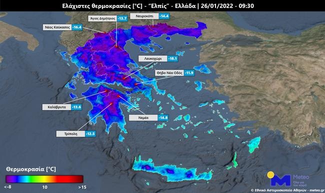 Στον παρακάτω χάρτη, με χρωματική κλίμακα παρουσιάζονται οι ελάχιστες θερμοκρασίες τις πρώτες πρωινές ώρες της Τετάρτης 26 Ιανουαρίου, όπως κατεγράφησαν από το δίκτυο αυτόματων μετεωρολογικών σταθμών του Εθνικού Αστεροσκοπείου Αθηνών / Meteo.gr, καθώς και οι τιμές από οκτώ επιλεγμένες περιοχές.