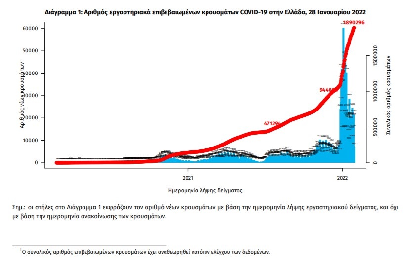 Τα νέα εργαστηριακά επιβεβαιωμένα κρούσματα της νόσου covid-19 που καταγράφηκαν τις τελευταίες 24 ώρες είναι 22.362, εκ των οποίων 84 εντοπίστηκαν κατόπιν ελέγχων στις πύλες εισόδου της χώρας. Ο συνολικός αριθμός των κρουσμάτων ανέρχεται σε 1.890.296 (ημερήσια μεταβολή +1,2%), εκ των οποίων 49,8% άνδρες. Με βάση τα επιβεβαιωμένα κρούσματα των τελευταίων7ημερών, 425 θεωρούνται σχετιζόμενα με ταξίδι από το εξωτερικό και 1.220 είναι σχετιζόμενα με ήδη γνωστό κρούσμα.