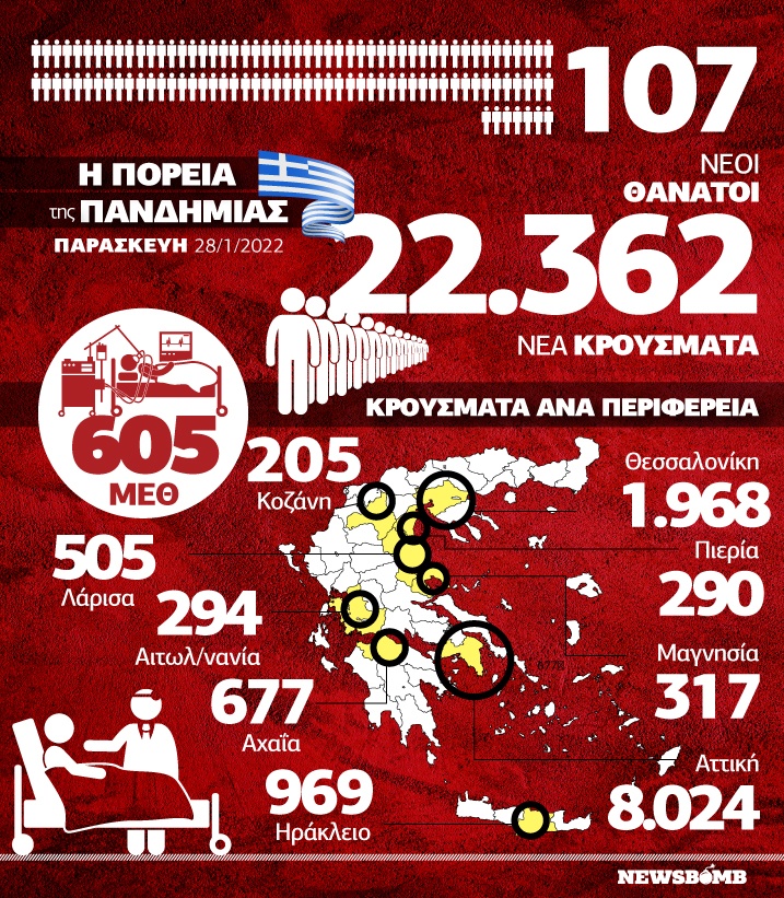 Πιο συγκεκριμένα, ο ΕΟΔΥ ανακοίνωσε σήμερα 22.362 νέα κρούσματα, εκ των οποίων 84 εντοπίστηκαν κατόπιν ελέγχων στις πύλες εισόδου της χώρας.