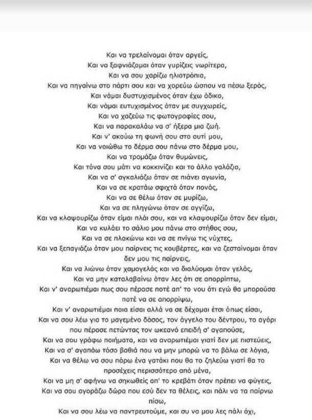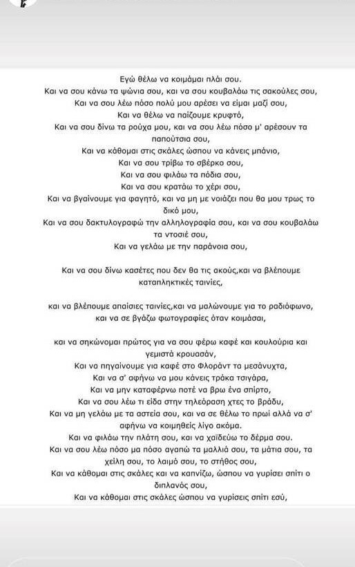 Με μια συγκλονιστική αναρτησή της στα μέσα κοινωνικής δικτύωσης η Διονυσία, σύντροφος του ηθοποιού, αποχαιρέτησε τον αγαπημένο της, ραγίζοντας καρδιές. Συγκεκριμένα δημοσίευσε 3 instastory με το Λαχταρώ (Crave). Πρόκειται για ένα ερωτικό μονόπρακτο της Αγγλίδας Sarah Kane, που αυτοκτόνησε στην ηλικία των 28 ετών το 1999.