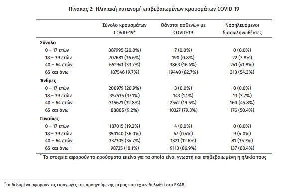 Οι νέοι θάνατοι ασθενών με COVID-19 είναι 119, ενώ από την έναρξη της επιδημίας έχουν καταγραφεί συνολικά 23.500 θάνατοι. Το 95.0% είχε υποκείμενο νόσημα ή/και ηλικία 70 ετών και άνω.