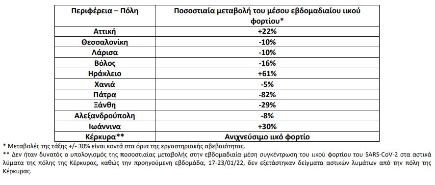 Πίνακας 1: Ποσοστιαία μεταβολή στη μέση συγκέντρωση του ιικού φορτίου του SARS-CoV-2 στα αστικά λύματα ανά 100.000 κατοίκους την εβδομάδα 24-30/01/22 σε σχέση με την εβδομάδα 17–23/01/22.