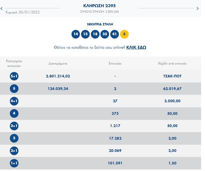 Υπενθυμίζετι ότι οι τυχεροί αριθμοί που έβγαλε η κληρωτίδα της περασμένης κλήρωσης ήταν οι: 15, 14, 18, 35, 41 και Τζόκερ ο αριθμός 8.