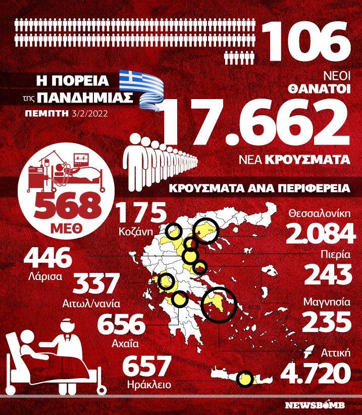 Κρούσματα σήμερα: 17.662 νέα ανακοίνωσε ο ΕΟΔΥ - 106 θάνατοι σε 24 ώρες, 568 οι διασωληνωμένοι