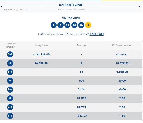 Οι τυχεροί αριθμοί που έβγαλε η κληρωτίδα της αποψινής κλήρωσης είναι οι: 5, 7, 13, 15, 36 και Τζόκερ ο αριθμός 8.