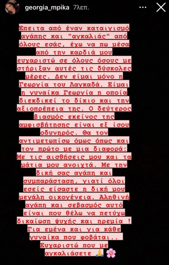 «Έπειτα από έναν καταιγισμό αγάπης και «αγκαλιάς» από όλους εσάς, έχω να πω μέσα από την καρδιά μου ευχαριστώ σε όλους όσους με στήριξαν αυτές τις δύσκολες μέρες. Δεν είμαι μόνο η Γεωργία του Λαγκαδά.