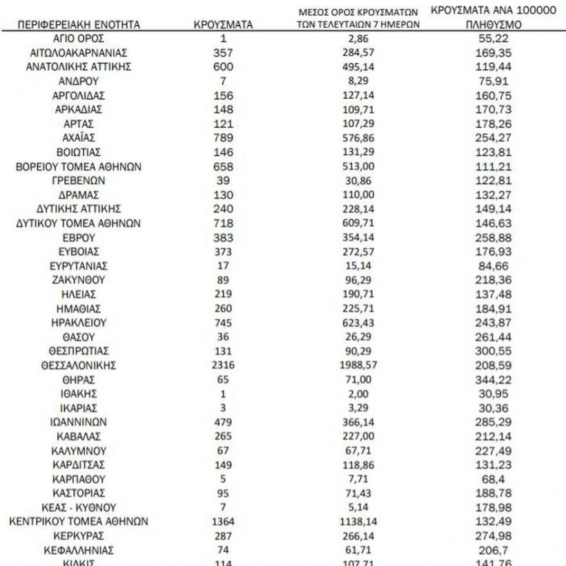 Επιπλέον, 41 περιοχές καταγράφουν τριψήφιο αριθμό κρουσμάτων.
