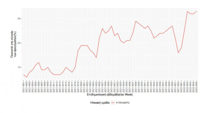 Τα κρούσματα στις ηλικίες αυτές αποτελούν το 33% των συνολικών κρουσμάτων της εβδομάδας αναφοράς και είναι αυξημένα κατά 3% σε σχέση με την προηγούμενη.