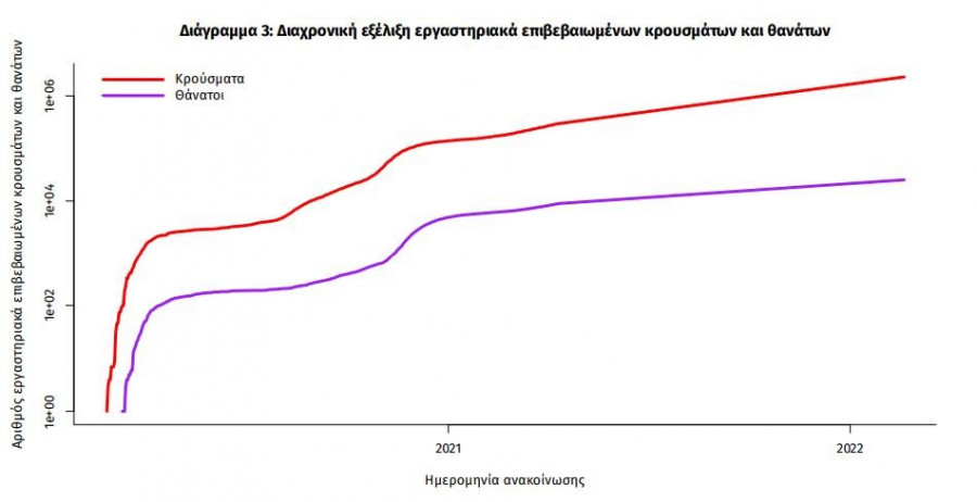 Η διαχρονική εξέλιξη των συνολικών κρουσμάτων και συνολικού αριθμού των θανάτων ασθενών COVID-19 παρουσιάζεται στο ακόλουθο διάγραμμα.