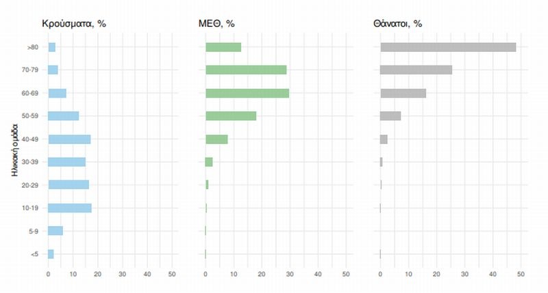 Οι εισαγωγές νέων ασθενών Covid-19 στα νοσοκομεία της επικράτειας είναι 363 (ημερήσια μεταβολή +20.6%). Ο μέσος όρος εισαγωγών του επταημέρου είναι 364 ασθενείς. Η διάμεση ηλικία των κρουσμάτων είναι 35 έτη (εύρος 0.2 έως 106 έτη), ενώ η διάμεση ηλικία των θανόντων είναι 79 έτη (εύρος 0.2 έως 106 έτη).