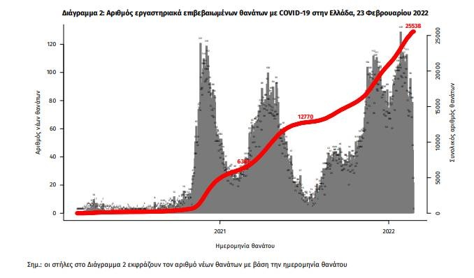 Οι νέοι θάνατοι ασθενών με COVID-19 είναι 53, ενώ από την έναρξη της επιδημίας έχουν καταγραφεί συνολικά 25.538 θάνατοι. Το 95.0% είχε υποκείμενο νόσημα ή/και ηλικία 70 ετών και άνω.