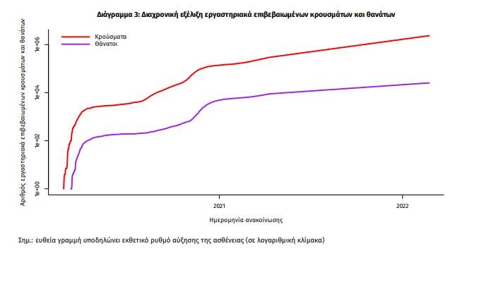 Η διαχρονική εξέλιξη των συνολικών κρουσμάτων και συνολικού αριθμού των θανάτων ασθενών COVID-19 παρουσιάζεται στο ακόλουθο διάγραμμα.