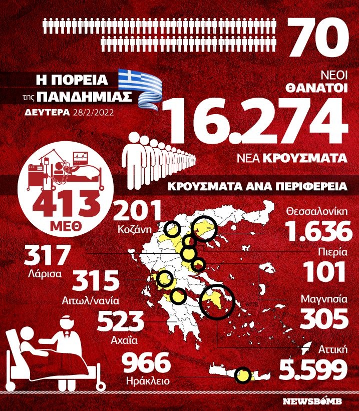 Πιο συγκεκριμένα, ο ΕΟΔΥ ανακοίνωσε σήμερα 16.274. Οι νέοι θάνατοι ασθενών με COVID-19 είναι 70, ενώ από την έναρξη της επιδημίας έχουν καταγραφεί συνολικά 25.860 θάνατοι. Το 95.1% είχε υποκείμενο νόσημα ή/και ηλικία 70 ετών και άνω.