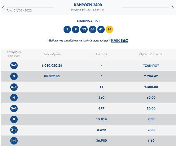 Ως αποτέλεσμα του αποψινού διπλού τζακ ποτ το τυχερό παιχνίδι του ΟΠΑΠ θα μοιράσει στην ερχόμενη κλήρωση της Πέμπτης (3/3), τουλάχιστον 1.300.000 ευρώ!