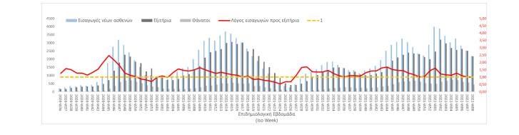 Την εβδομάδα αναφοράς, οι εισαγωγές νέων ασθενών ήταν 2.187, ενώ το σύνολο των εξιτηρίων λόγω ίασης ήταν 2.182. O λόγος εισαγωγών νέων