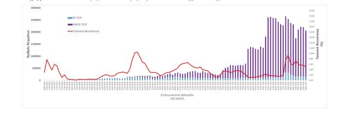 Σύμφωνα με τον ΕΟΔΥ, την ίδια εβδομάδα το ποσοστό θετικότητας ήταν 5.07% σε σύνολο 2.064.538 εργαστηριακών ελέγχων (RT-PCR/Rapid-Ag) και 1.23% σε σύνολο 2.988.440 αυτοδιαγνωστικών ελέγχων.