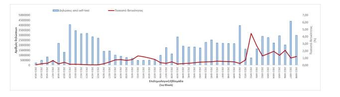 Ποσοστό θετικότητας ανά ISO WEEK με βάση το σύνολο των αυτοδιαγνωστικών ελέγχων COVID-19.