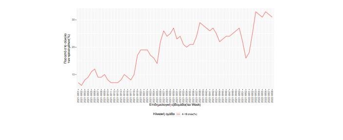 Την εβδομάδα αναφοράς, το σύνολο των ασθενών ηλικίας 4-18 ετών είναι 32.571, αποτελώντας το 31% (-3% από την προηγούμενη εβδομάδα)