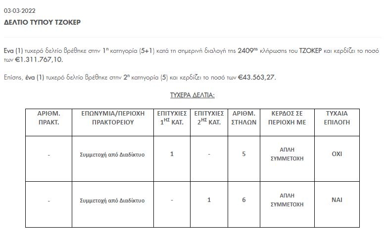 Όπως ανακοίνωσε ο ΟΠΑΠ και τα δύο τυχερά δελτία του Τζόκερ συμπληρώθηκαν μέσω διαδικτύου.