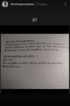 Η Διονυσία Γεωργιάδου έχασε τον αγαπημένο της το πρωί της 29ης Ιανουαρίου σε ένα τραγικό τροχαίο δυστύχημα με μηχανή στο κέντρο της Αθήνας. Η νεαρή κοπέλα έκανε μία συγκινητική ανάρτηση στον προσωπικό της λογαριασμό στο Instagram, δημοσιεύοντας στίχους από ένα ποίημα, αφιερωμένους στον Πάνο Νάτση.