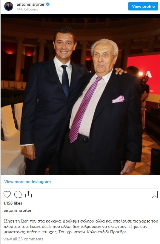 «Έζησε τη ζωή του στα κόκκινα. Δούλεψε σκληρά αλλά και απόλαυσε τις χαρές του πλούτου του. Έκανε deals που άλλοι δεν τολμούσαν να σκεφτούν. Έζησε σαν μεγιστάνας, πέθανε φτωχός. Του χρωστάω. Καλό ταξίδι Πρόεδρε», έγραψε ο Αντώνης Σρόιτερ.