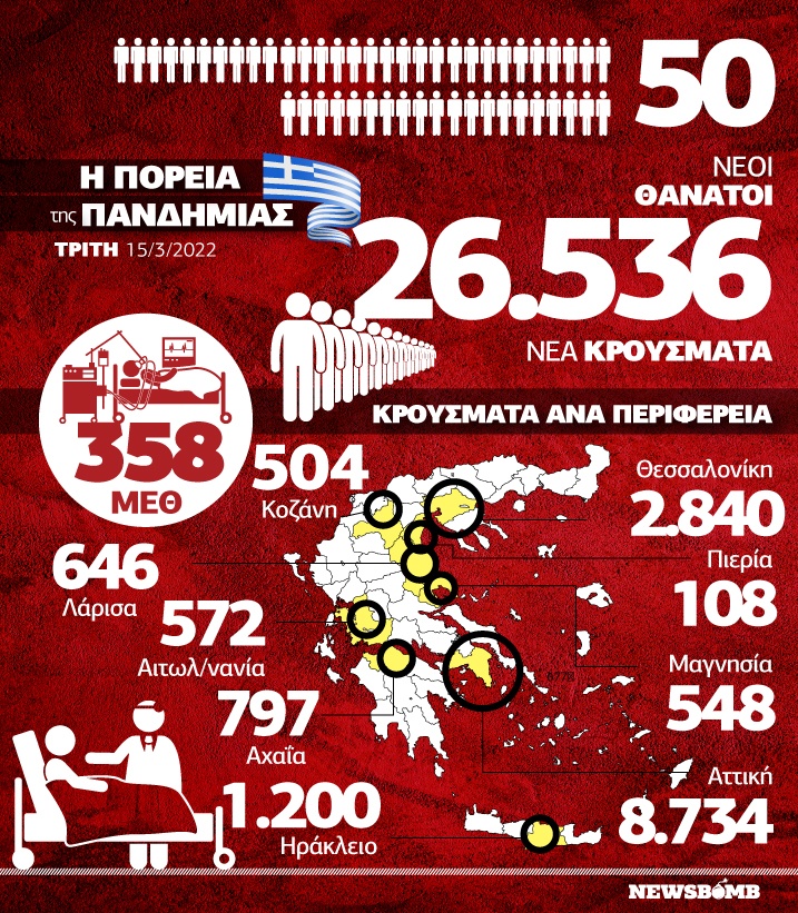 Πιο συγκεκριμένα, ο ΕΟΔΥ ανακοίνωσε σήμερα 26.536 νέα κρούσματα. Οι νέοι θάνατοι ασθενών με COVID-19 είναι 50, ενώ από την έναρξη της επιδημίας έχουν καταγραφεί συνολικά 26.686 θάνατοι. Το 95.2% είχε υποκείμενο νόσημα ή/και ηλικία 70 ετών και άνω.