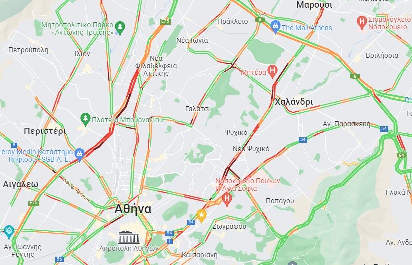 Μποτιαλιαρισμένη είναι και η Κηφισίας μέχρι το ύψος του Χαλανδρίου, ενώ κίνηση υπάρχει και στους δρόμους γύρω από το κέντρο της Αθήνας και του Πειραιά.
