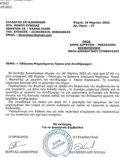 Η καταγγελία έγινε από τον Πρόεδρο του συλλόγου των εργαζομένων του ΟΤΑ νομού Εύβοιας και Διευθυντή Διοίκησης, Προγραμματισμού, Οργάνωσης και Ανάπτυξης Δήμου Διρφύων Μεσσαπίων Δημήτρη Βοργιά.