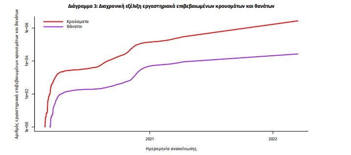 Η διαχρονική εξέλιξη των συνολικών κρουσμάτων και συνολικού αριθμού των θανάτων ασθενών COVID-19 παρουσιάζεται στο ακόλουθο