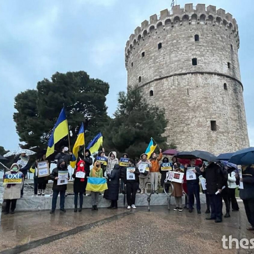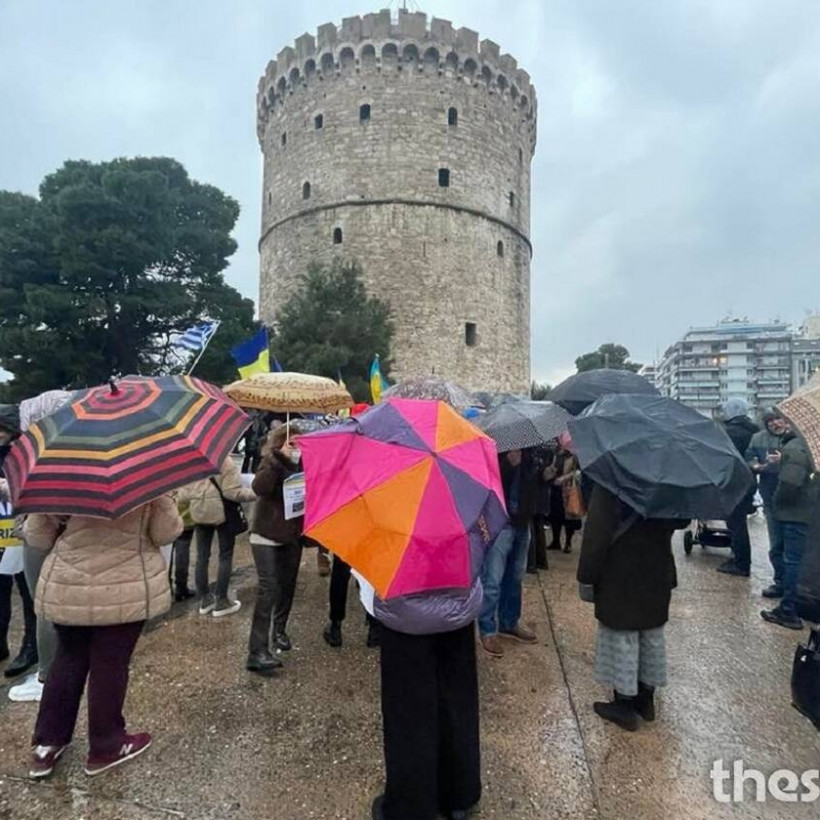 Με πλακάτ και σημαίες της Ουκρανίας, πολίτες της Θεσσαλονίκης και Ουκρανοί που ζουν στην πόλη συγκεντρώθηκαν, υπό βροχή, στον Λευκό Πύργο για να εκφράσουν την αντίθεση τους στον πόλεμο.