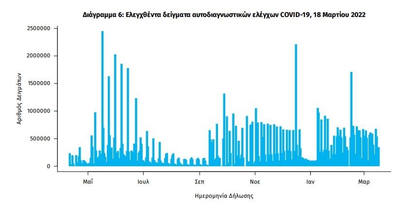 Αυτοδιαγνωστικοί έλεγχοι (Self-tests): Έως 17 Μαρτίου 2022, έχουν καταγραφεί ηλεκτρονικά 96.049.615 δηλώσεις αποτελέσματος αυτοδιαγνωστικού ελέγχου, ενώ 5.853.120 άτομα προσήλθαν για επανέλεγχο.
