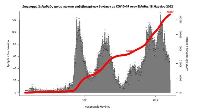 Οι νέοι θάνατοι ασθενών με COVID-19 είναι 55, ενώ από την έναρξη της επιδημίας έχουν καταγραφεί συνολικά 26.847 θάνατοι. Το 95.2% είχε υποκείμενο νόσημα ή/και ηλικία 70 ετών και άνω.