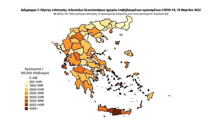 Γεωγραφική διασπορά: Ο χάρτης αποτυπώνει τη γεωγραφική κατανομή των κρουσμάτων COVID-19 των τελευταίων 14 ημερών ανά Περιφερειακή Ενότητα της χώρας, με βάση την δηλωθείσα διεύθυνση μόνιμης κατοικίας του