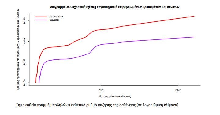 Η διαχρονική εξέλιξη των συνολικών κρουσμάτων και συνολικού αριθμού των θανάτων ασθενών COVID-19 παρουσιάζεται στο ακόλουθο διάγραμμα.