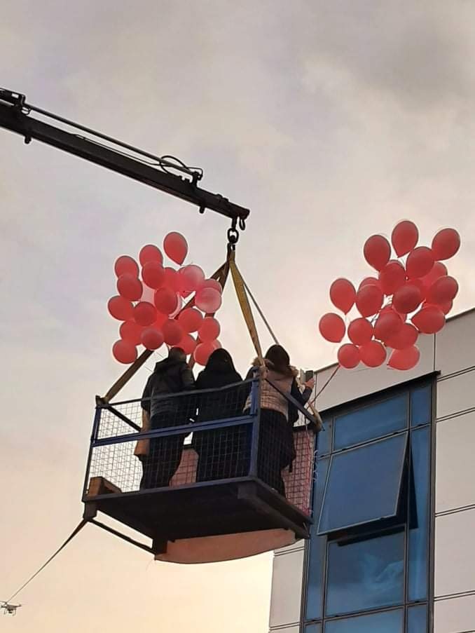 «Ήρθαν εσκεμμένα εκείνη την ώρα να μου μετρήσουν την πίεση και το οξυγόνο για να είμαι απασχολημένη. Ο σύζυγός μου είχε κλείσει και τις κουρτίνες -καθώς ήταν όλα προμελετημένα, και τη στιγμή που μιλούσα με τη μαία, ακούω απ' έξω μουσική, τραγούδια, κόρνες και φωνές. Ανοίγουν την κουρτίνα, με πηγαίνουν με το κρεβάτι μου δίπλα στο παράθυρο, μου φέρνουν τη μικρή αγκαλιά και βλέπω τα αγαπημένα μου πρόσωπα πάνω σε ένα καλάθι γερανού», περιγράφει με συγκίνηση η κ. Μπάνιου.