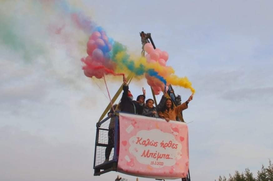 Χειριστής γερανού ήταν ο μπαμπάς της νεαρής λεχώνας. Ο 55χρονος Σάκης Μπάνιου, διασώστης ΕΚΑΒ, έχει δίπλωμα χειρισμού τέτοιων μηχανημάτων καθώς ασχολούνταν με το συγκεκριμένο επάγγελμα από το 1996. Έπιασε ξανά το τηλεχειριστήριο για τα μάτια της εγγονής του και ανέβηκε στο καλάθι μαζί με την οικογένεια, για μια ανύψωση στα δέκα μέτρα. «Ο γιος μου απέκτησε δίδυμα κοριτσάκια και τώρα ήρθε μια ακόμη νεράιδα», λέει, φορώντας το μπλουζάκι που του χάρισαν οι εγγονές του, με το λογότυπο: «ο πιο όμορφος παππούς».