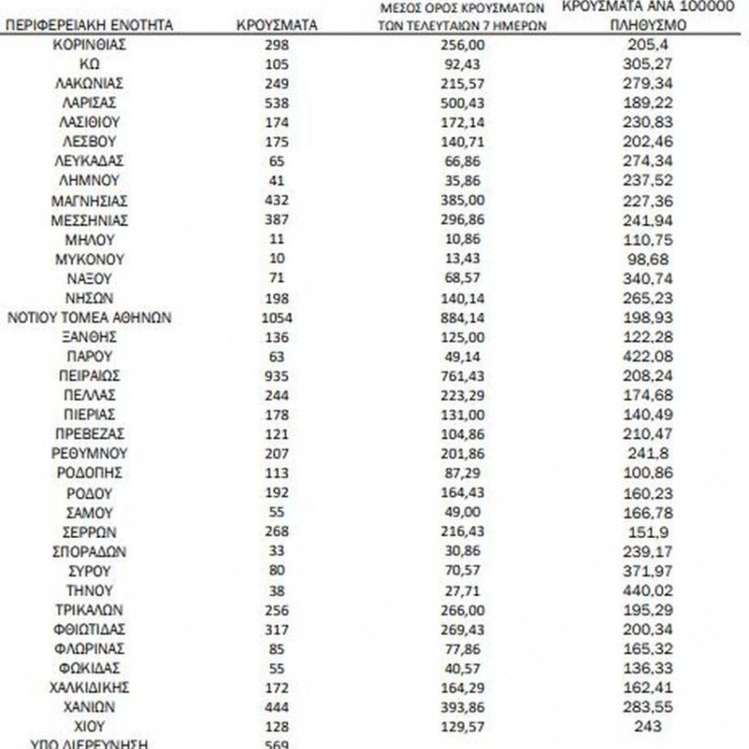 Κατανομή ανακοινωθέντων εγχώριων κρουσμάτων: Από το σύνολο των 23.106 νέων κρουσμάτων του νέου ιού στη χώρα 21 είναι εισαγόμενα εκ των οποίων 20 εντοπίστηκαν κατόπιν ελέγχων στις πύλες εισόδου της χώρας. Η κατανομή των 23.085 νέων εγχώριων κρουσμάτων ανά Περιφερειακή Ενότητα παρουσιάζεται στον κατωτέρω πίνακα.