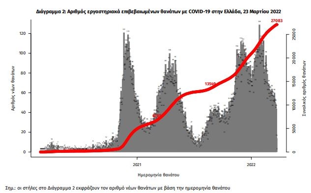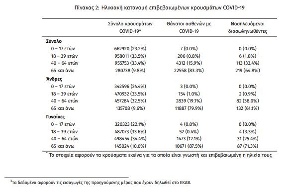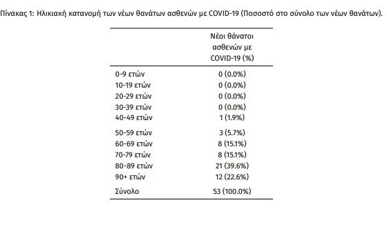 Οι νέοι θάνατοι ασθενών με COVID-19 είναι 53, ενώ από την έναρξη της επιδημίας έχουν καταγραφεί συνολικά 27.083 θάνατοι. Το 95.3% είχε υποκείμενο νόσημα ή/και ηλικία 70 ετών και άνω.