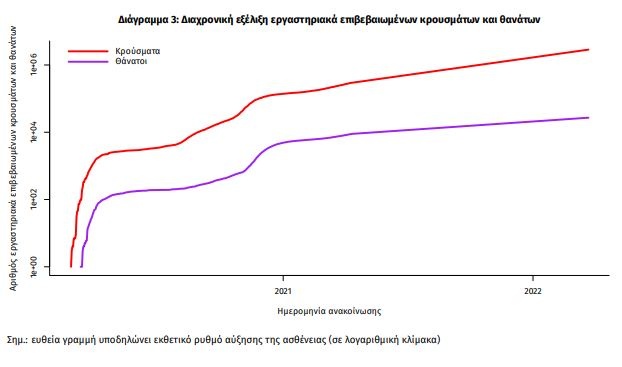 Η διαχρονική εξέλιξη των συνολικών κρουσμάτων και συνολικού αριθμού των θανάτων ασθενών COVID-19 παρουσιάζεται στο ακόλουθο διάγραμμα.