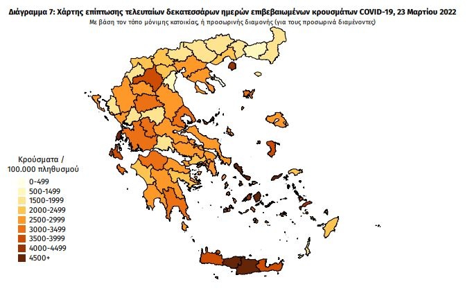 Γεωγραφική διασπορά: Ο χάρτης αποτυπώνει τη γεωγραφική κατανομή των κρουσμάτων COVID-19 των τελευταίων 14 ημερών ανά Περιφερειακή Ενότητα της χώρας, με βάση την δηλωθείσα διεύθυνση μόνιμης κατοικίας του ασθενούς, ή τη διεύθυνση προσωρινής διαμονής για τους τουρίστες και άλλους προσωρινά διαμένοντες στην Ελλάδα. Συμπεριλαμβάνονται τόσο κρούσματα με ιστορικό ταξιδιού (“εισαγόμενα”) όσο και κρούσματα με πιθανή εγχώρια μετάδοση.