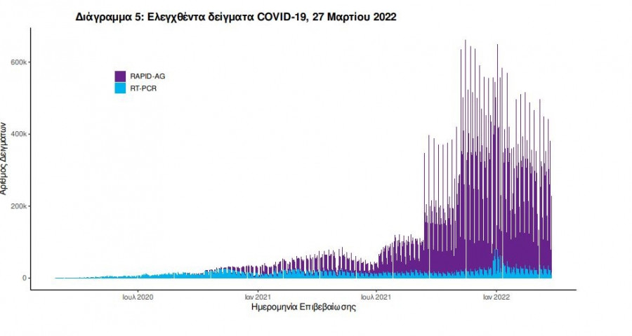 συνολικά ελεγχθεί 10.477.195 κλινικά δείγματα ενώ από Μονάδες Υγείας και Κλιμάκια του ΕΟΔΥ που διενεργούν ελέγχους Rapid Ag έχουν ελεγχθεί 62.460.864 δείγματα. O μέσος όρος του επταημέρου είναι 256.232 δειγματοληπτικοί