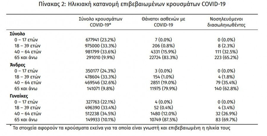 Οι νέοι θάνατοι ασθενών με COVID-19 είναι 52, ενώ από την έναρξη της επιδημίας έχουν καταγραφεί συνολικά 27.268 θάνατοι. Το 95.3% είχε υποκείμενο νόσημα ή/και ηλικία 70 ετών και άνω.