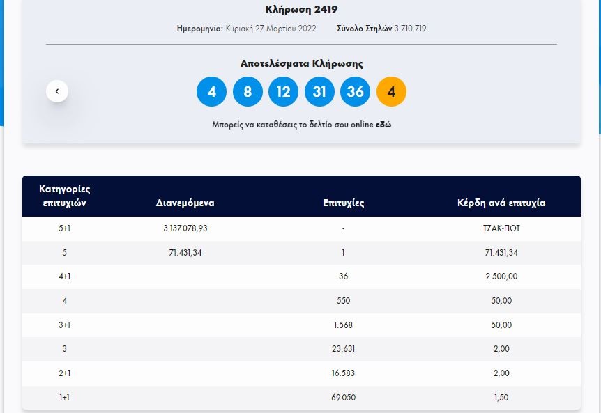 Ως αποτέλεσμα της αποψινής κλήρωσης το Τζόκερ θα μοιράσει στους νικητές της πρώτης κατηγορίας της ερχόμενης κλήρωσης της Τρίτης (29/3), τουλάχιστον 3.000.00 ευρώ!
