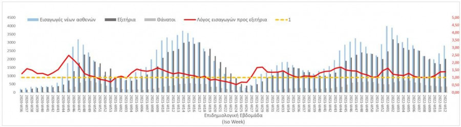 Την εβδομάδα αναφοράς, οι εισαγωγές νέων ασθενών ήταν 2.817, ενώ το σύνολο των εξιτηρίων λόγω ίασης ήταν 2.024. O λόγος εισαγωγών νέων ασθενών προς εξιτήρια λόγω ίασης ήταν 1.39