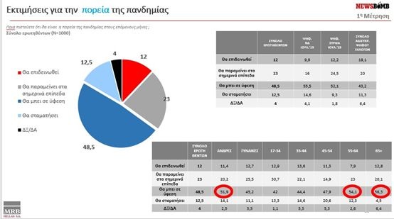 Σύμφωνα με τα στοιχεία της έρευνας το 48,5% θεωρεί ότι η πανδημία θα μπει σε ύφεση ενώ το 12,5% πιστεύει ότι θα σταματήσει. Υπάρχει βέβαια και ένα ποσοστό 12% που θεωρεί ότι η κατάσταση θα επιδεινωθεί. Πιο αισιόδοξοι δείχνουν να είναι οι άντρες από τις γυναίκες. Ο αντρικός πληθυσμός σε ποσοστό 51,9% είναι πιο αισιόδοξο σε σχέση με τις γυναίκες 48,5%.