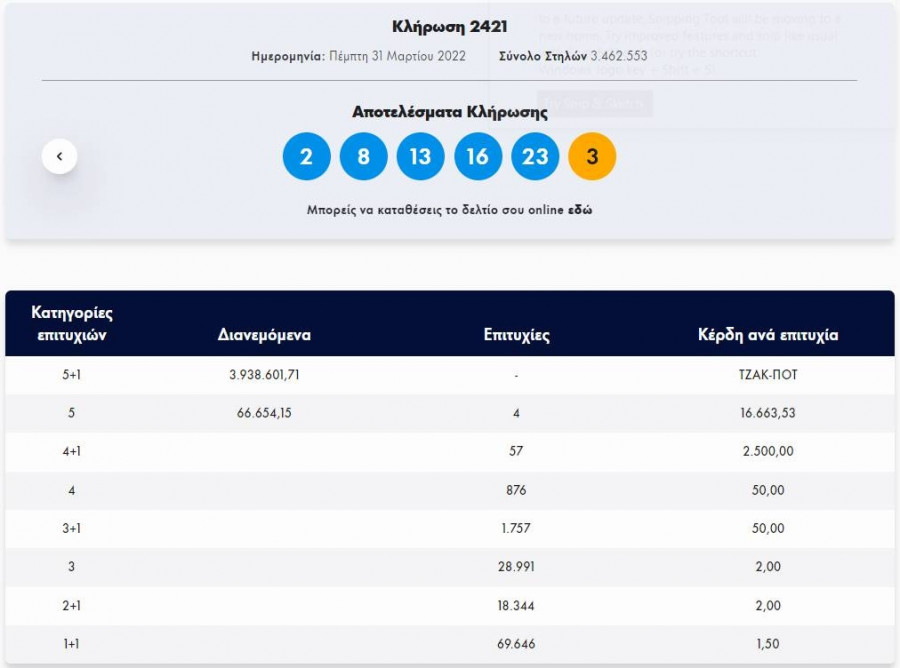 Ως αποτέλεσμα του αποψινού τζακ ποτ το τυχερό παιχνίδι του ΟΠΑΠ θα μοιράσει στην ερχόμενη κλήρωση της Κυριακής (3/4) τουλάχιστον 4.500.000 ευρώ στους νικητές της πρώτης κατηγορίας.