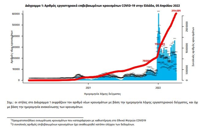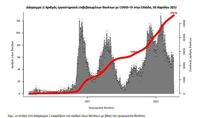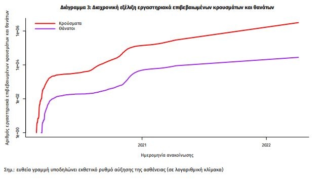 Η διαχρονική εξέλιξη των συνολικών κρουσμάτων και συνολικού αριθμού των θανάτων ασθενών COVID-19 παρουσιάζεται στο ακόλουθο διάγραμμα.
